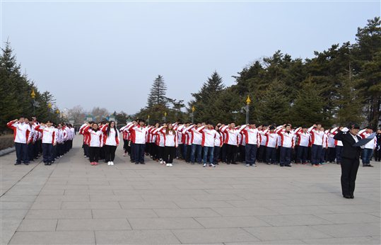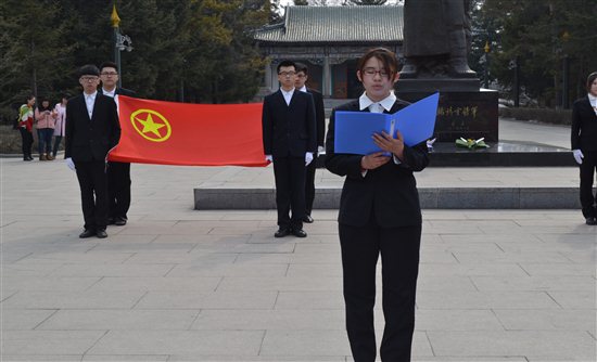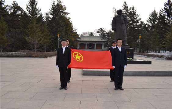 面对着火红的旗帜,似乎见到了先人奔腾的热血,激励着我们不断向前,努力进取,不忘国耻。同学们以敬佩的目光望着杨靖宇将军塑像,嗓音洪亮地唱团歌,并在杨靖宇将军塑像前庄严宣誓,铿锵有力的宣誓声是同学们对先辈崇高的敬意。