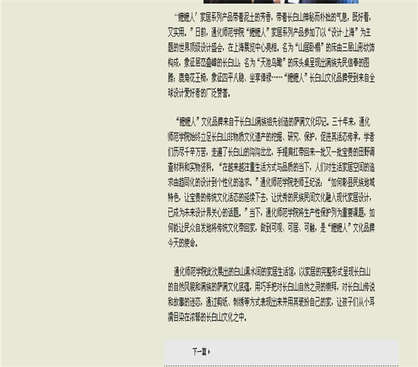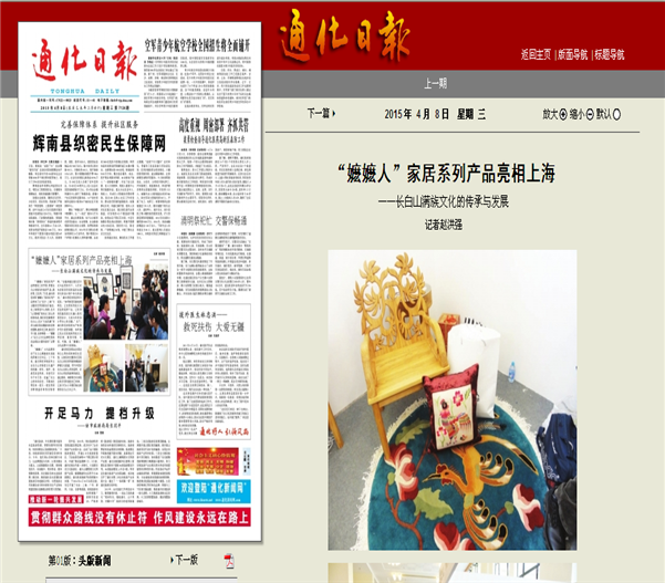 2015年3月27日——30日,通化师范学院“嬷嬷人”家居系列产品在上海展览中心亮相,参加以“设计·上海”为主题的世界顶级设计盛会。本次展会共吸引了全球300多顶级品牌参加。“嬷嬷人”长白山生活品牌受到来自全球设计爱好者的广泛关注。