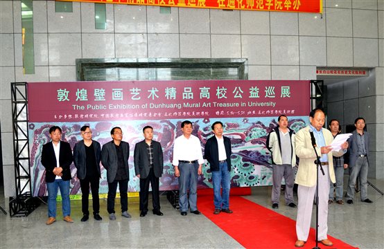 5月14日上午9时30分,敦煌壁画艺术精品高校公益巡展开幕式在我校美术馆举行。敦煌研究院副秘书长杨秀清,通化市美术家协会、梅河口市美术家协会领导,以及我校校长康学伟,副校长杨秀祖、姜国,长白山文化研究院院长栾英良,美术学院领导、老师和同学们参加了开幕式。
