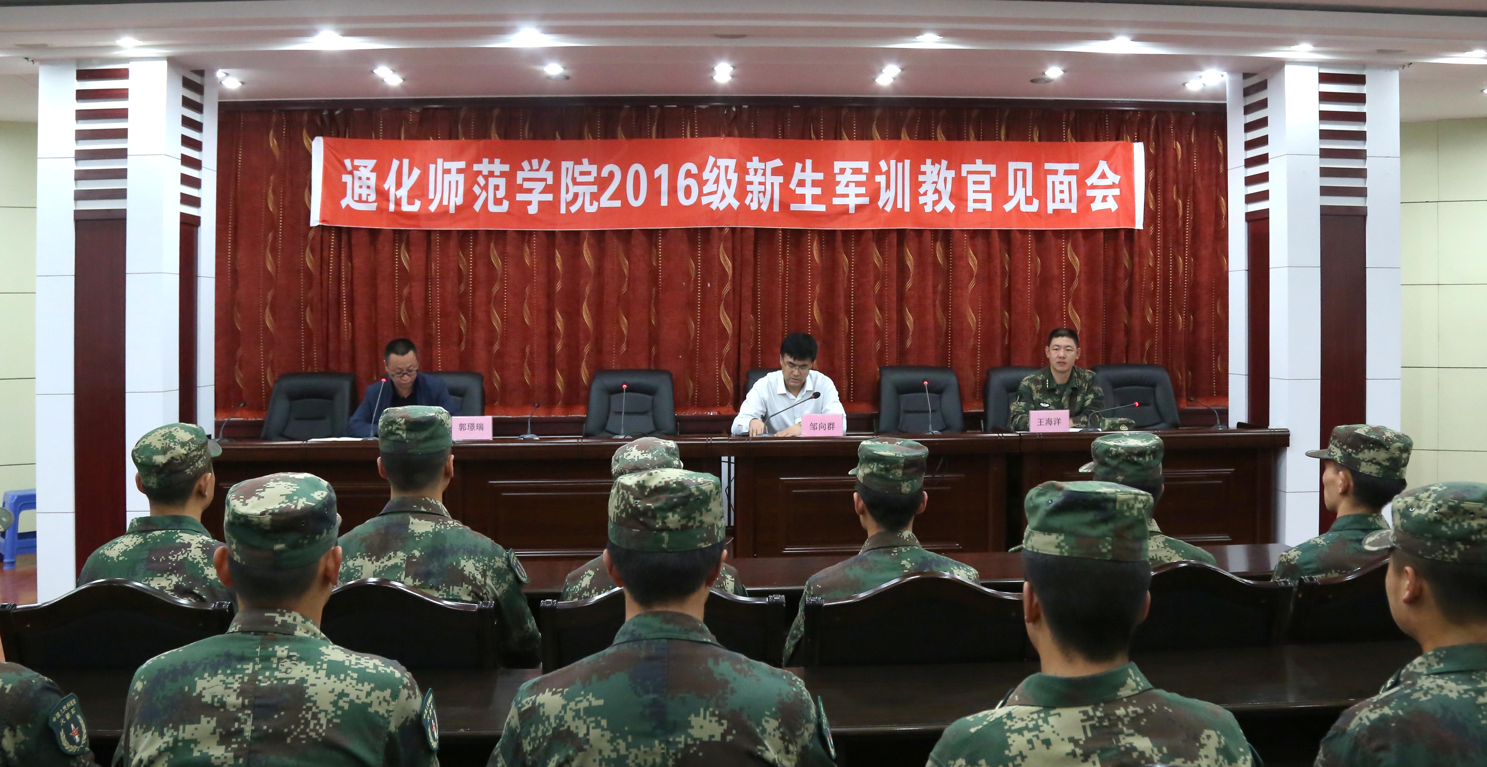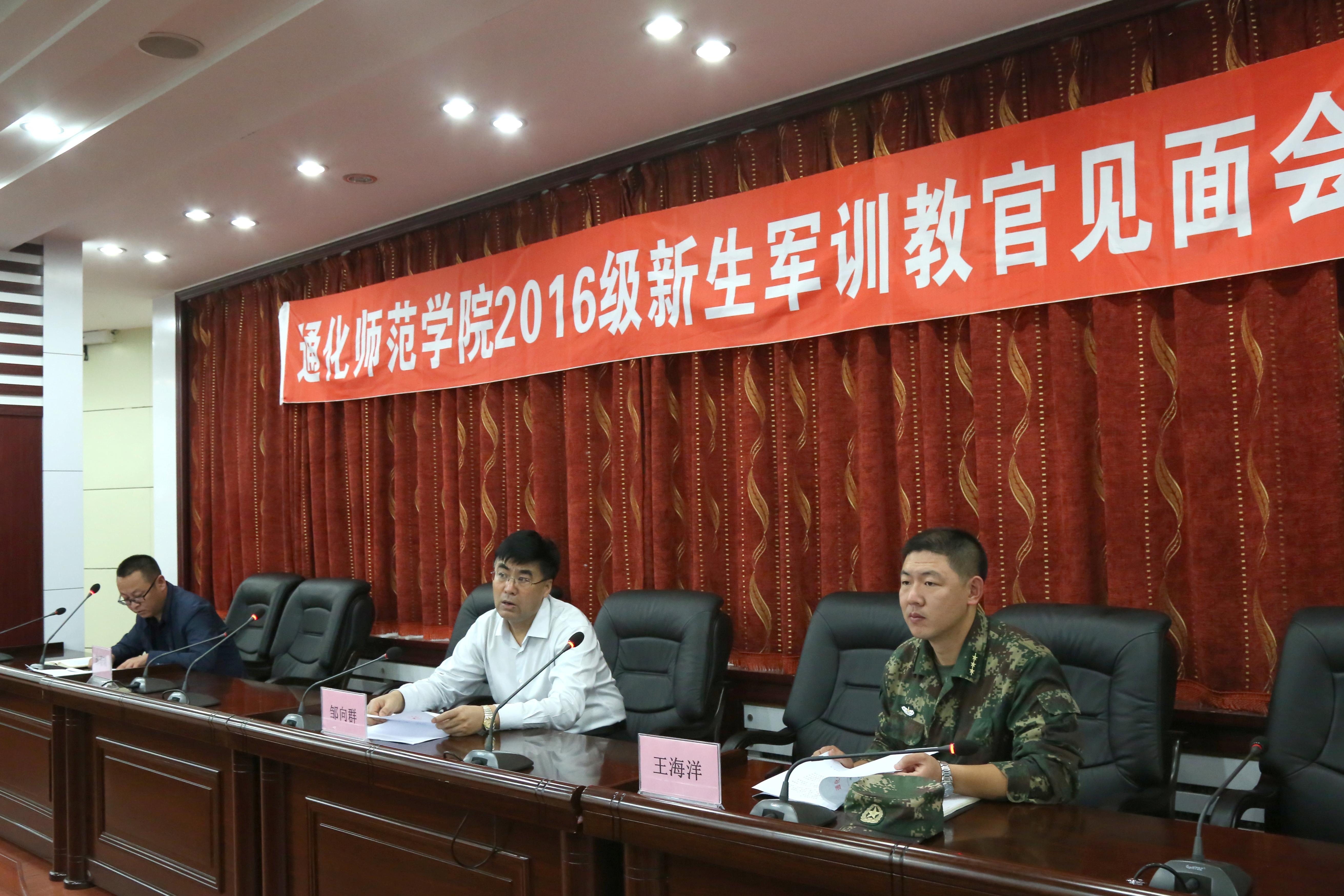 (新闻网讯 学工处报道)9月8日上午,我校2016级新生军训教官见面会在行政楼9407会议室举行。校党委副书记邹向群出席会议并讲话,承训部队领队王海洋,学校武装部部长郭璟瑞,全体承训教官,各学院分管学生工作领导及辅导员老师参加了会议。