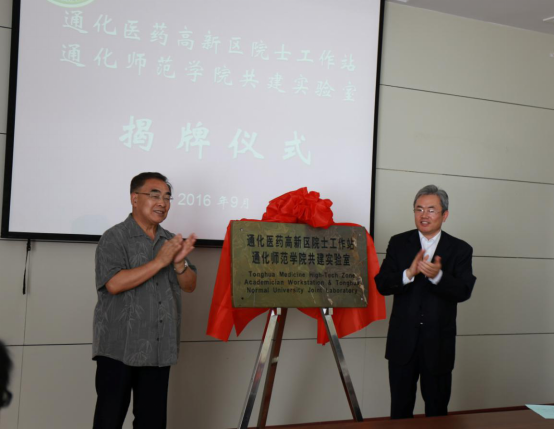 张伯礼院士和王忠书记共同为通化医药高新区院士工作站通化师范学院共建实验室揭牌。