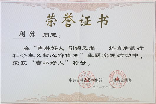 (新闻网讯 宣传部报道)我校生命科学学院教师周繇在“吉林好人 引领风尚——培育和践行社会主义核心价值观”主题实践活动中,荣获“吉林好人”称号。希望全校教职工以先进典型为榜样,把立德树人作为教育的根本使命,坚守“质朴的教育”理念,为学校的发展建设贡献新的力量。