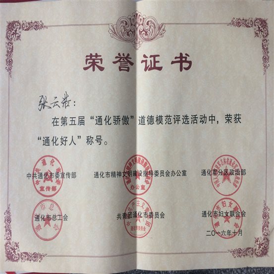 张云浩在第五届“通化骄傲”道德模范评选中荣获“通化好人”称号