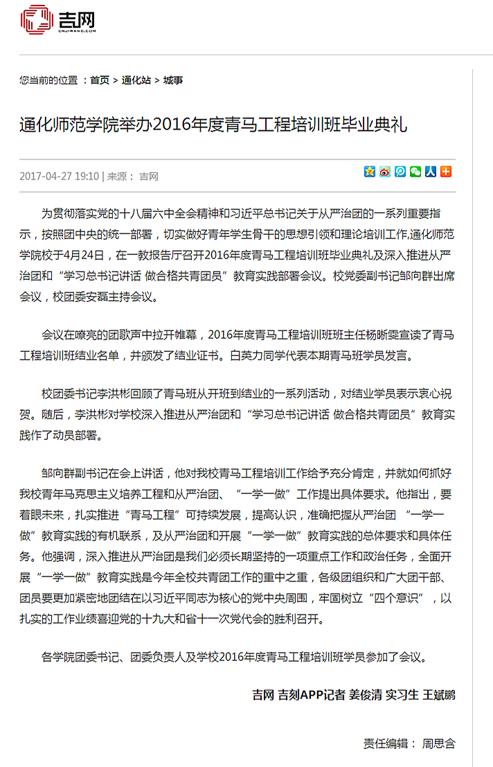 4月27日,中国吉林网报道我校举办2016年度青马工程培训班毕业典礼新闻,敬请广大师生关注。