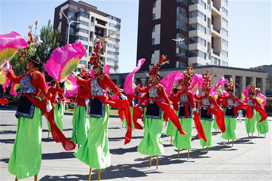 启动仪式上,我校作为项目保护单位,组织通化县快大茂镇龙头村农民进行了高跷秧歌队表演。表演者们身着红衣搭配满族传统补绣围裙,腰系彩带,随着鼓声节奏不停变换队形,现场气氛十分热烈。我校音乐学院百余名学生参加了此次启动仪式,并为大会提供礼仪服务。