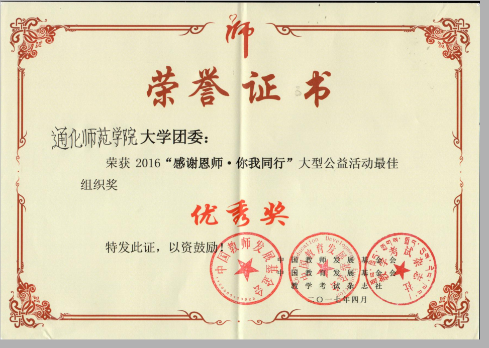 (新闻网讯 校团委报道)近日,2016年度“感谢恩师,你我同行”大型公益活动总结表彰大会在华北电力大学举行。本次活动中,我校团委荣获由中国教师发展基金会、中国教育发展基金会及教学考试杂志社颁发的“优秀组织奖”,我校参加活动的同学中有35人获得社会实践证书,其中常天娇、康雅楠两名同学荣获“优秀感恩大使”称号。他们在此次活动中弘扬了社会主义核心价值观,传递了正能量,向社会展现了通师学子的温暖情怀。