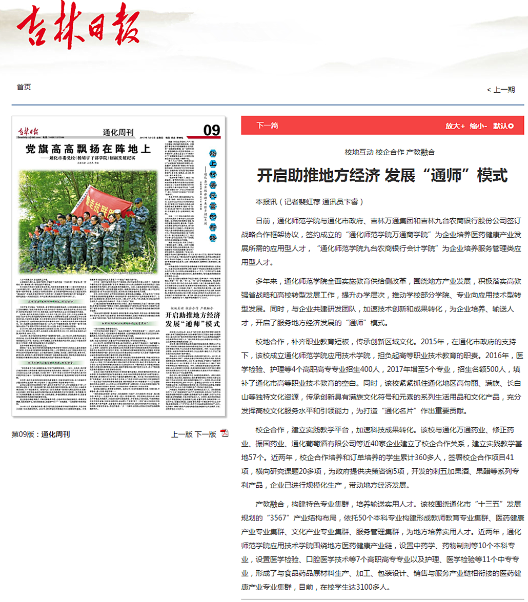 7月6日,吉林日报9版以《开启助推地方经济 发展“通师”模式》为题,报道我校校地校企合作新闻。敬请广大师生关注。